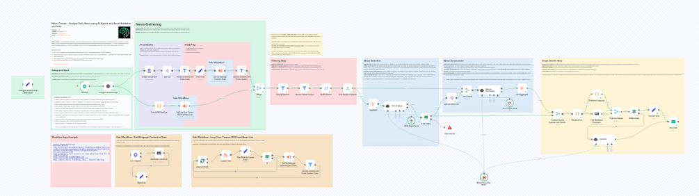 - Sub-Workflows for Enhanced Functionality: Includes sub-workflows to handle specific tasks, such as retrieving webpage content and looping through custom RSS feeds.